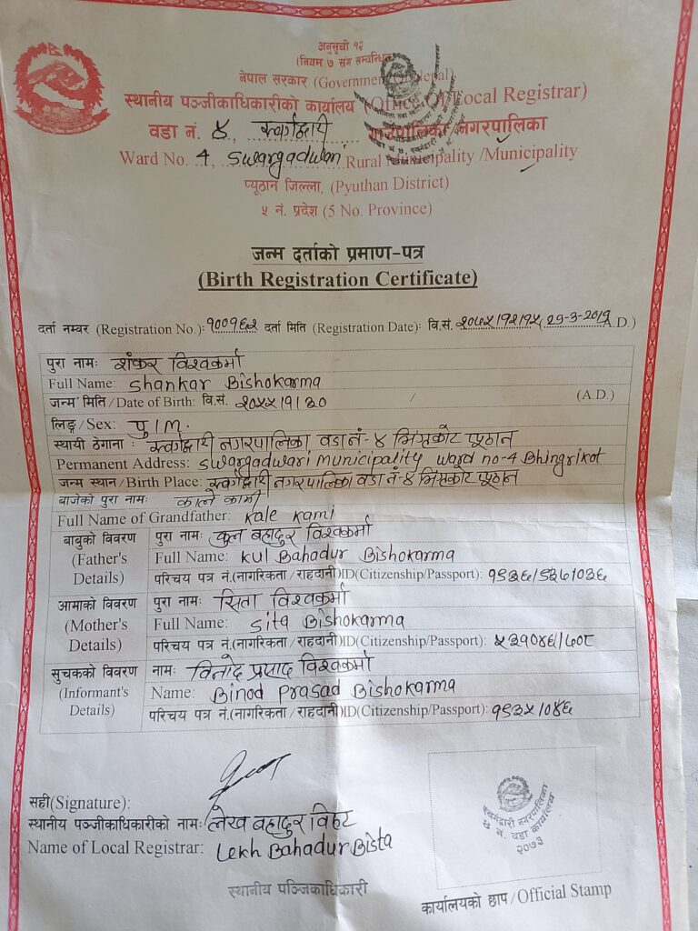 प्यूठान । भिंगृमा लालपुर्जा सहति महत्वपुर्ण कागजपत्रहरु फेला परेको छ । विहिवार सामुदायीक रेडियो स्वर्गभुमी ९३ मेगाहर्ज भिगृका स्टेशन म्यानेजर सिपी पौडेलले भिगृमा भेटाउनु भएको हो । कागजपत्रमा स्वर्गद्वारी नगरपालिका वडा ४ भिगृकोट निवासी कुल बहादुर विश्वकर्माको नागरीकता , लालपुर्जा र छोरा शंकर विश्वकर्माको जन्मदर्ता रहेको पौडेलले प्यूठान अनलाईनलाई जानकारी दिनुभयो ।