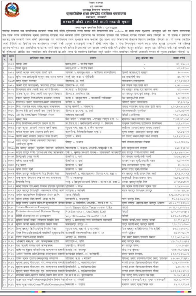 प्यूठान । सरकारलाई तिर्नुपर्ने रकम नतिरेका ५२ जनाको तीनपुस्ते विवरण सरकारले सार्वजनिक गरेको छ ।यो विवरणमा प्यूठानका २ जना ब्यक्तिको नाम समेत समाबेश छ ।महालेखा नियन्त्रकको कार्यालय अन्तर्गतको कुमारी चोक तथा केन्द्रीय तहसिल कार्यालय बबरमहलले ती व्यक्तिको नाम, ठेगाना र तिर्नुपर्ने रकमसहितको विवरण आज सार्वजनिक गर्दै ३५ दिनभित्र साँवा ब्याज तिर्न भनेको छ ।अन्यथा उनीहरुको चल अचल सम्पत्ति दाबी गरी प्रचलित कानुन बमोमिज असुल उपर गर्ने चेतावनी दिइएको छ ।